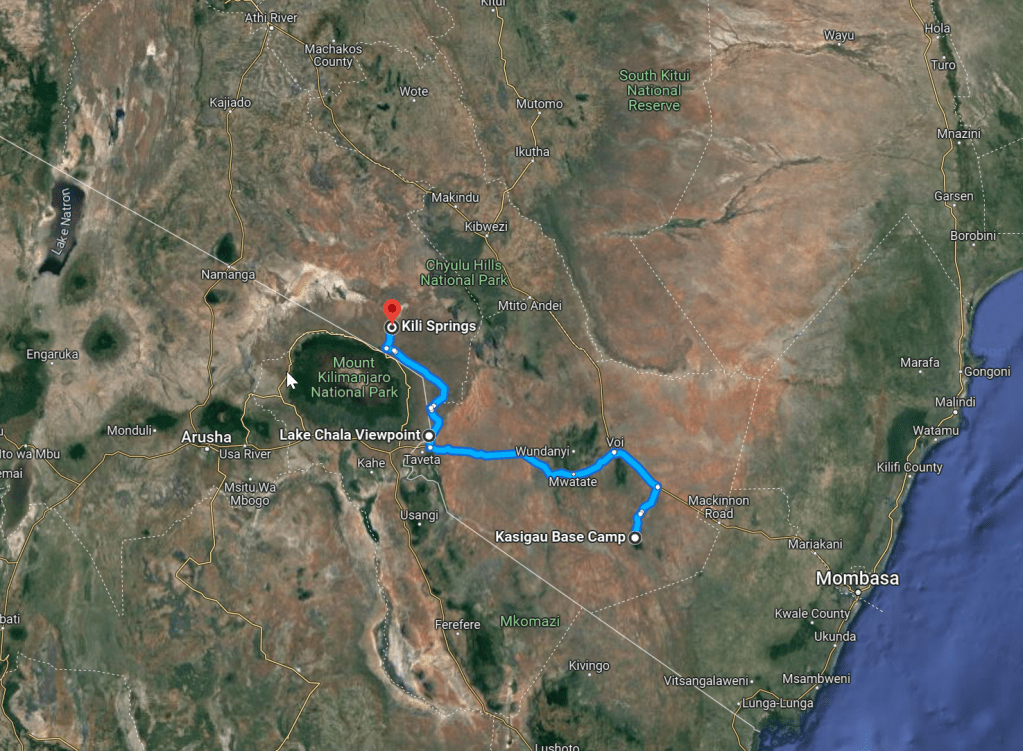We split the route from the coast to the Amboseli over two days, stopping for the night at a campground that most likely hasn’t seen tourists in months. It is quiet, however, and offers us space to camp, fire, and bush toilets (KES 1’000 per adult/per night).